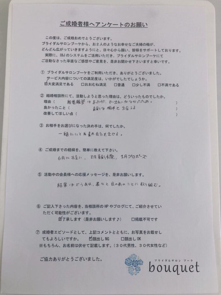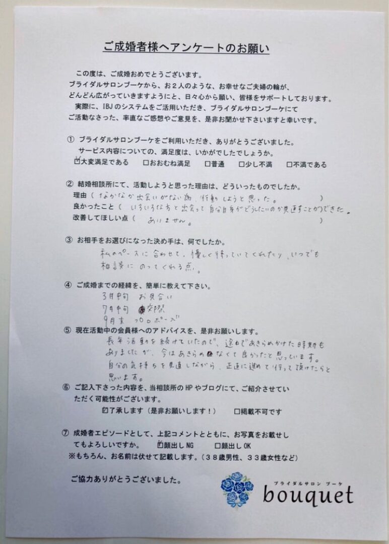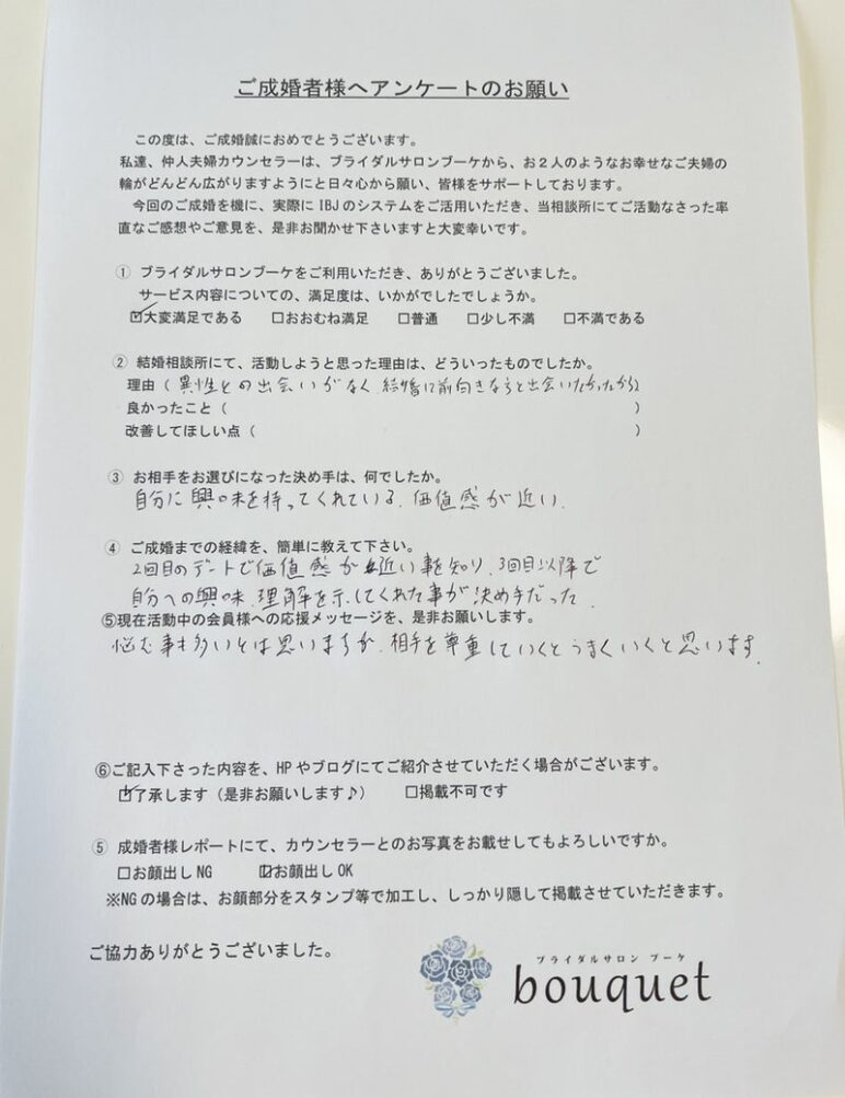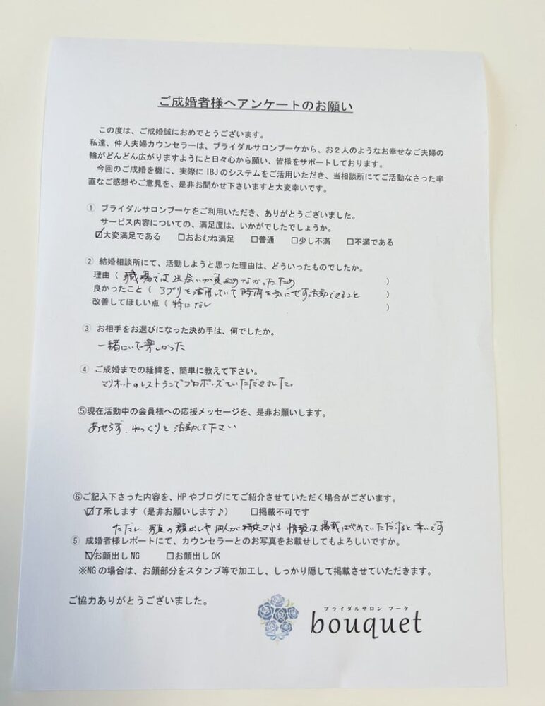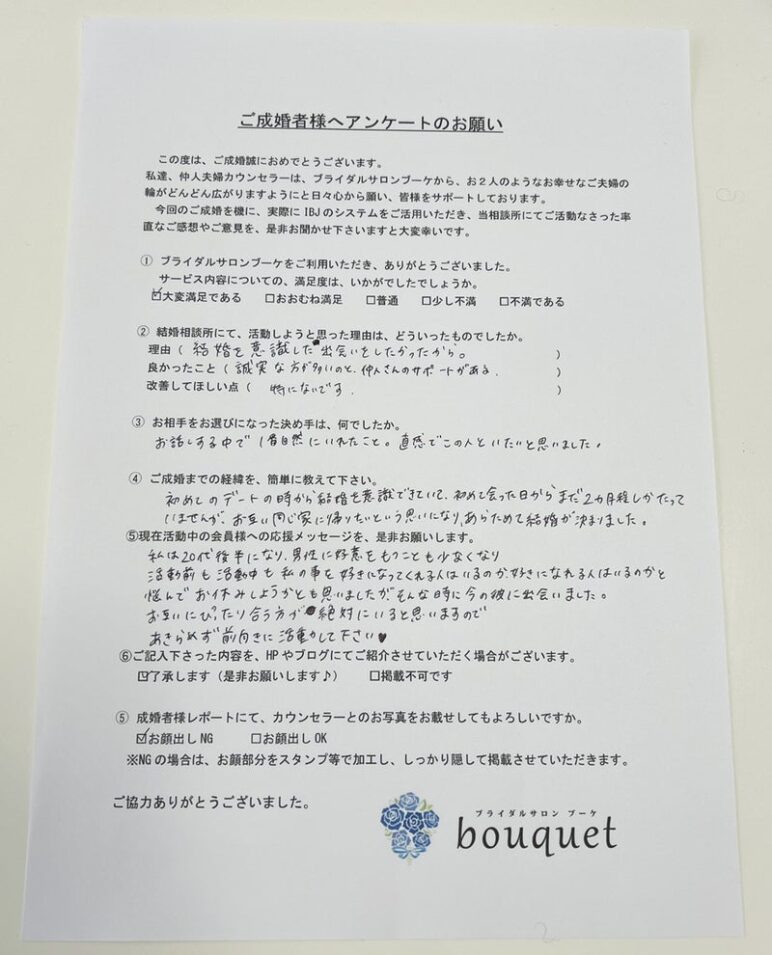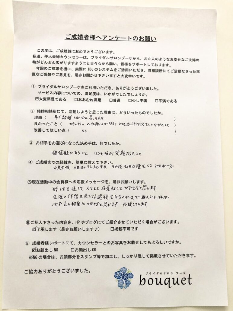 名古屋の結婚相談所ブライダルサロンbouquetでご成婚された会員様の手書きアンケートをご紹介します