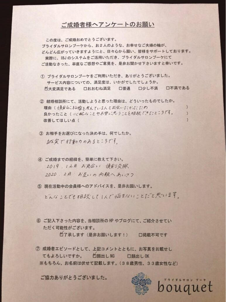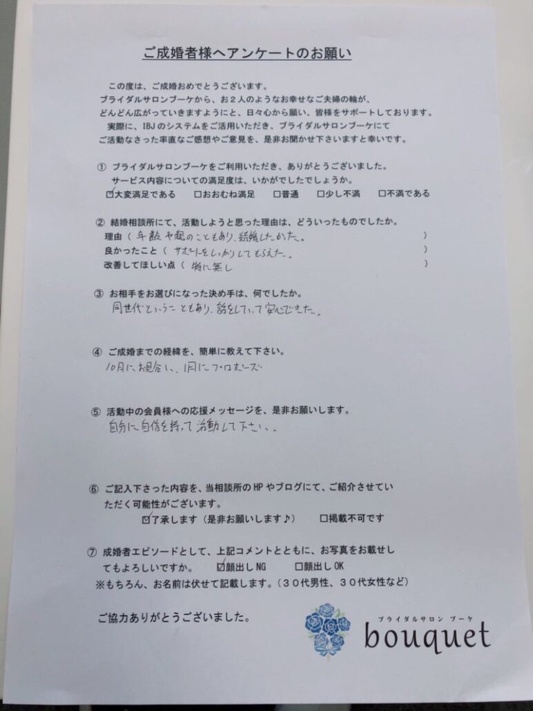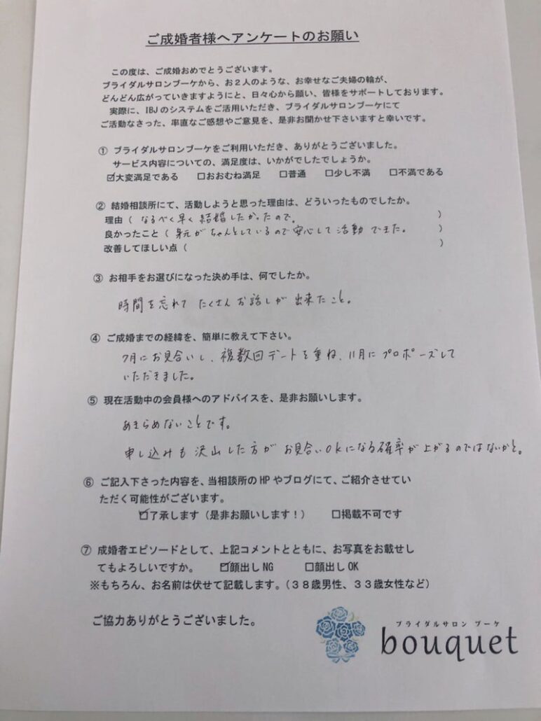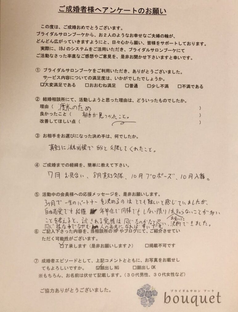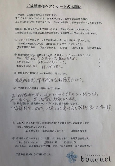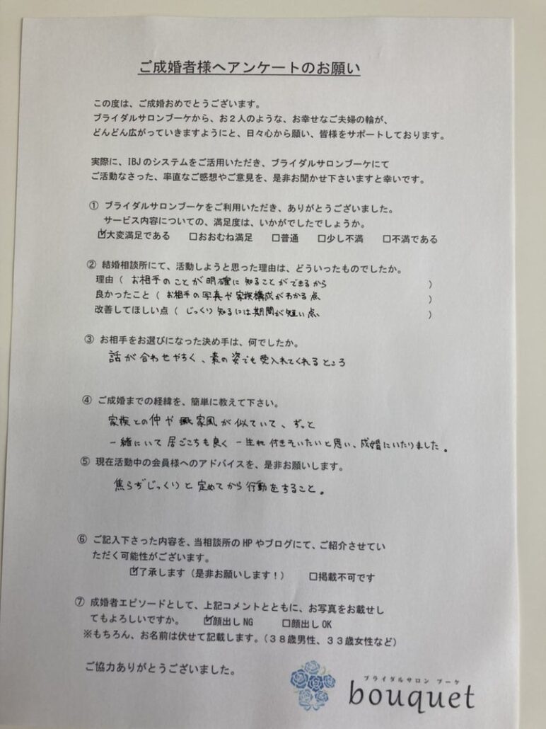 名古屋の結婚相談所ブライダルサロンbouquetでご成婚された会員様の手書きアンケートをご紹介します